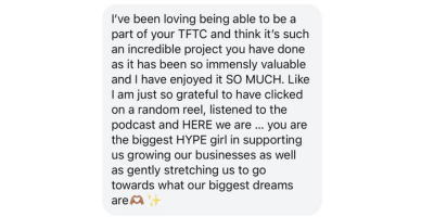 "It has been so much more than I had anticipated in terms of the level of support, and the outcomes I have experienced. I set up a profitable business whilst working full time and it felt easeful! I 100% attribute that to TFC. Mia holds space in such a kind and intuitive way, and is insightful and creative in her recommendations. Mia is individualised in her approach to support, and is absolutely your biggest cheerleader! Here for you through the sticky times and the big wins."