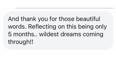 "I have started my business, sticking to 3 days a week 9.30-3.30 for day care pick up and drop offs as I said in my intention document! And lots of interest in my business due to accurate messaging and marketing! I didn’t realise just how important marketing was!